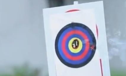 只听轰的一声,世东说念主还莫得反馈过来,射击靶上在1环的位置出现了烧焦的陈迹。